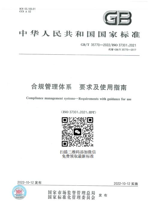 2022年10月12日起,GB/T 35770-2022《合規(guī)管理體系 要求及使用指南》開始實(shí)施!代替原來的GB/T 35770-2017版本,有需要的朋友可以微信搜索手機(jī)號18925394581或掃描以下二維碼添加微信進(jìn)行領(lǐng)取!